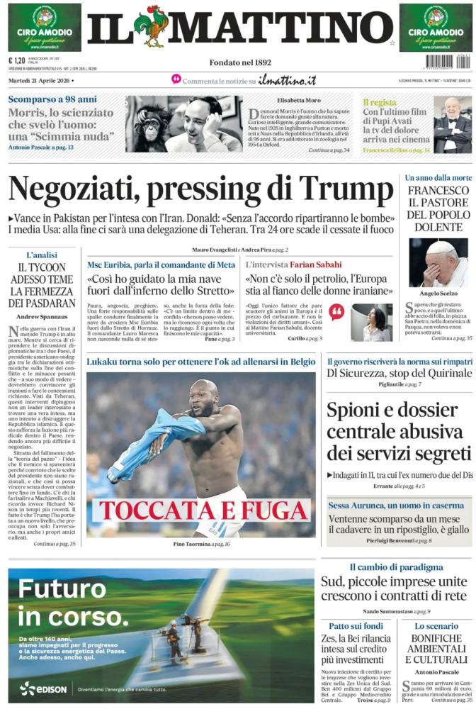 "Toccata e fuga", apre così in prima pagina Il Mattino nell'edizione odierna, parlando di Big Rom che ha avuto un incontro con il Napoli per poi fare subito rientro in patria. Il sommario: "Lukaku torna solo per ottenere l'ok ad allenarsi in Belgio". Di seguito la prima pagina integrale.