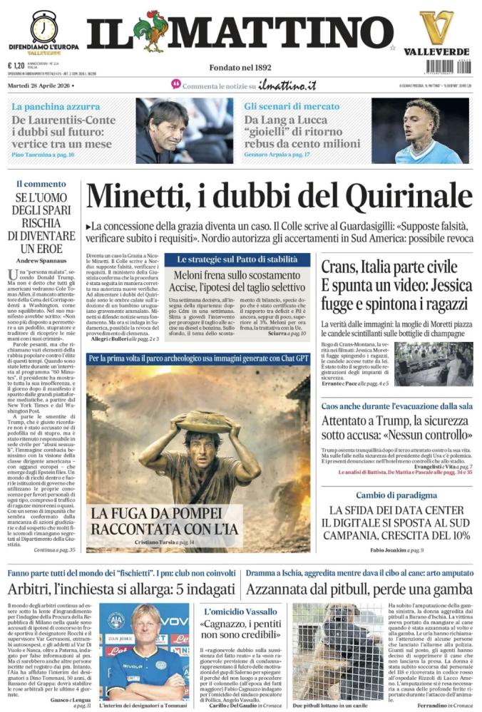"La panchina azzurra. De Laurentiis-Conte, i dubbi sul futuro: vertice tra un mese", scrive così in prima pagina l'edizione odierna de Il Mattino, che dedica il taglio alto al capitolo allenatore ma anche al calciomercato: "Da Lang a Lucca, 'gioielli' di ritorno: rebus da cento milioni". In taglio basso, invece, spazio allo scandalo che ha scosso il calcio italiano negli ultimi giorni: "Arbitri, l'inchiesta si allarga: 5 indagati. Fanno parte tutti del mondo dei 'fischietti'. I pm: club non coinvolti". Di seguito la prima pagina integrale.