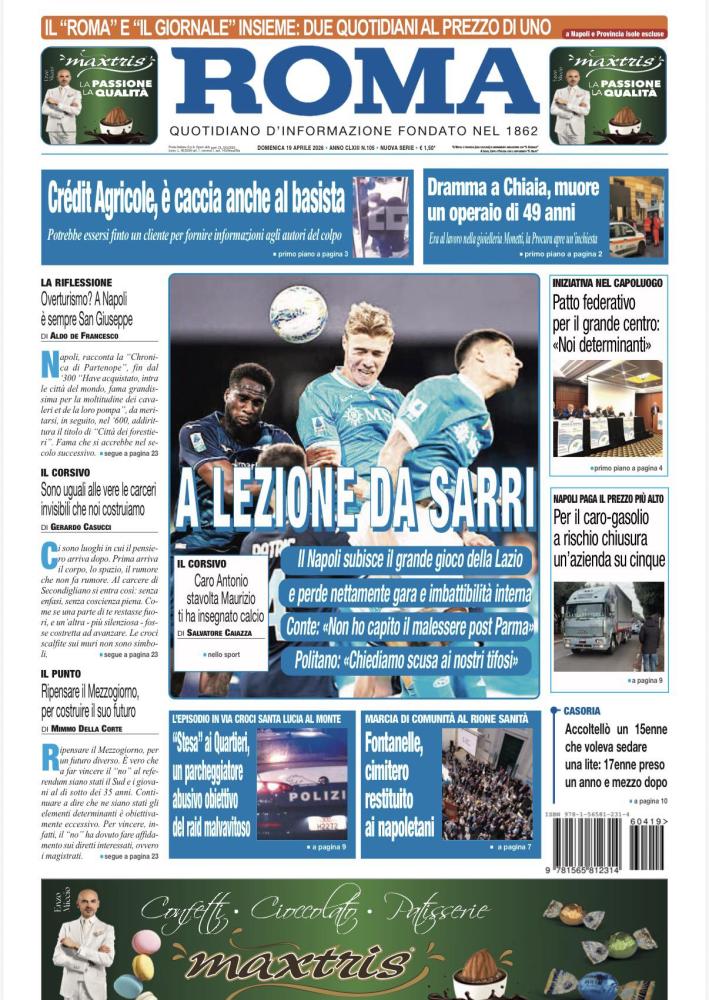 "A lezione da Sarri", apre così in prima pagina il quotidiano Il Roma nell'edizione odierna, bacchettando la pessima prestazione degli azzurri di Antonio Conte al Maradona. Il sommario: "Il Napoli subisce il grande gioco della Lazio e perde nettamente gara e imbattibilità interna. Conte: «Non ho capito il malessere post Parma». Politano: «Chiediamo scusa ai nostri tifos»". Di seguito la prima pagina integrale.