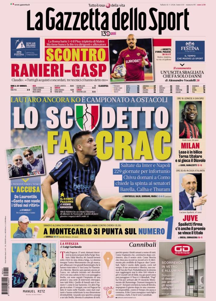 Apertura della Gazzetta dello Sport dedicata all’infortunio di Lautaro Martinez: “Lo scudetto fa crac”. Sono infatti più di 229 le giornate saltate dai giocatori di Inter e Napoli. Spazio anche proprio agli azzurri con le parole di De Laurentiis su Conte e sui tifosi presenti ai ritiri.