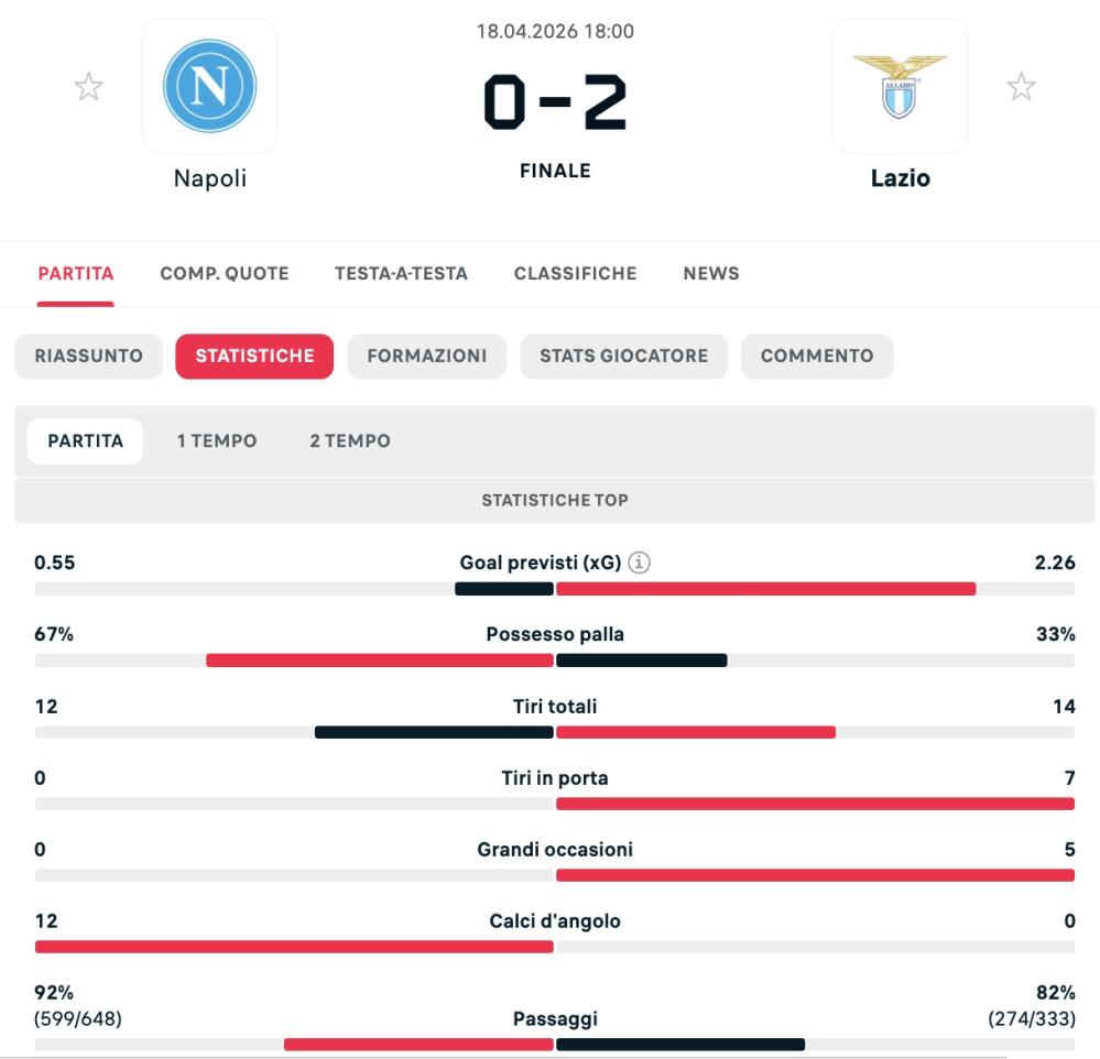 Napoli umiliato! La Lazio domina con 7 tiri in porta a 0 e quasi 2,3xG a 0,5