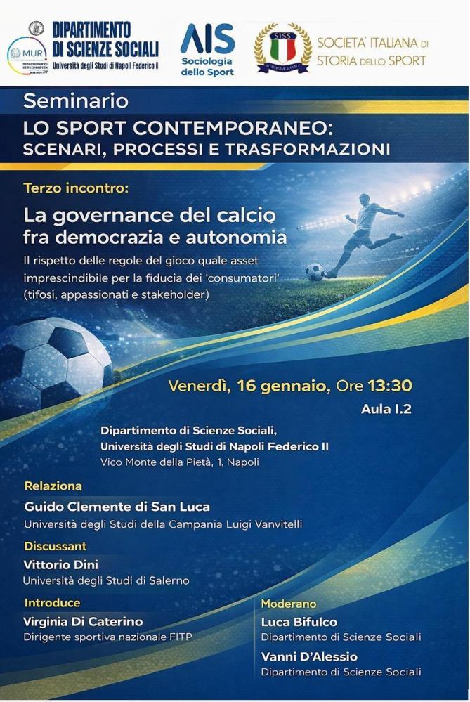 “Lo Sport contemporaneo: scenari, processi e trasformazioni”, è il titolo del seminario tenuto dal professor Guido Clemente di San Luca, docente di Giuridicità delle regole del calcio presso il Dipartimento di Giurisprudenza dell'Università Vanvitelli. L’incontro, giunto al suo terzo appuntamento, si svolgerà venerdì 16 gennaio alle ore 13:30 presso l’Università Federico II, in Aula I.2, e sarà dedicato in particolare al tema “La governance del calcio, fra democrazia e autonomia”. Di seguito la locandina dell’evento.