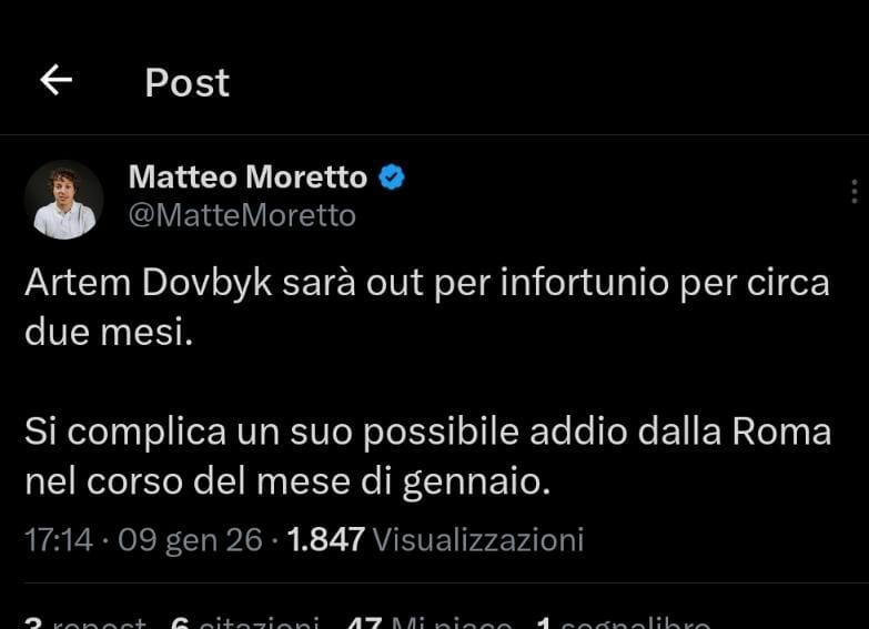 Si complicano le cose per un ipotetico passaggio nel mese di gennaio di Artem Dovbyk dalla Roma al Napoli. Secondo quanto scritto dal giornalista ed esperto di mercato internazionale Matteo Moretto sul proprio account X, in un post poi eliminato, l'attaccante ucraino sarà out per due mesi a causa della lesione muscolare accusata durante il match contro il Lecce.