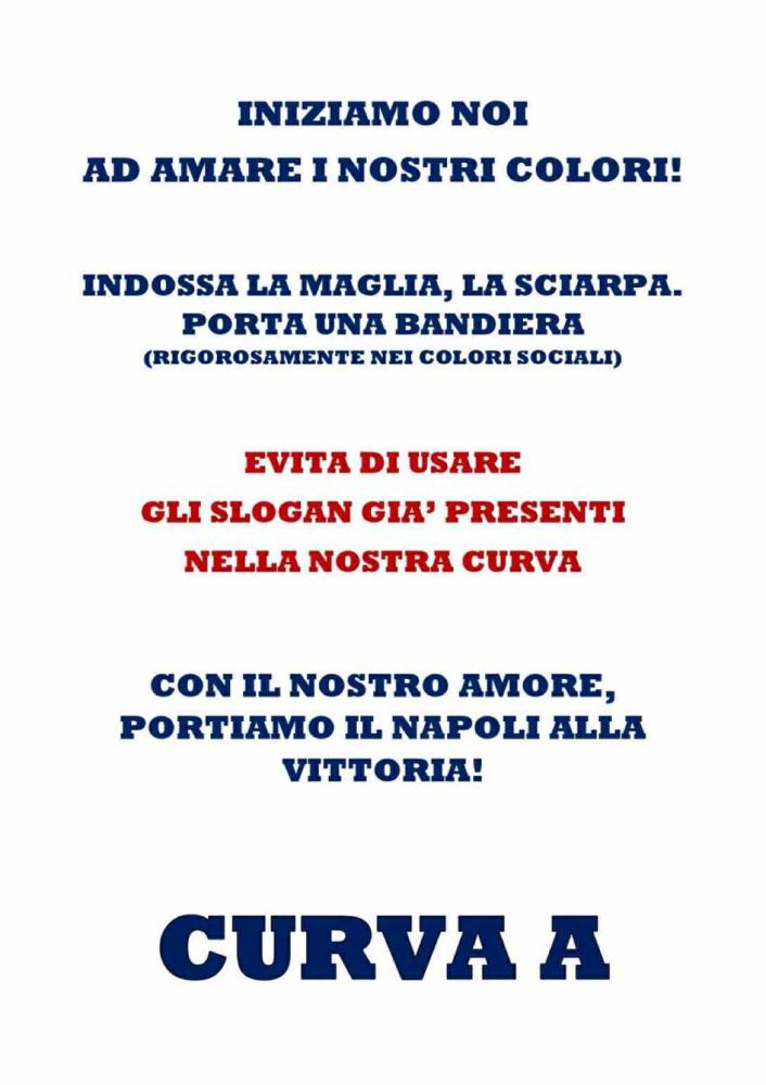 “Indossa la maglia, la sciarpa. Porta una bandiera (rigorosamente nei colori sociali). Evita di usare gli slogan già presenti nella nostra curva. Con il nostro amore, portiamo il Napoli alla vittoria!”, è questo il messaggio diffuso tramite volantino dalla Curva A prima di Napoli-Cagliari. Un incitamento a tifare e trascinare i ragazzi di Antonio Conte in questa ultima partita di campionato che potrebbe assegnare il quarto scudetto agli azzurri. Di seguito la foto.