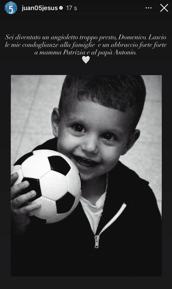 "Sei diventato un angioletto troppo presto, Domenico. Lascio le mie condoglianze alle famiglie e un abbraccio forte forte a mamma Patrizia e al papà Antonio", questo il messaggio di cordoglio di Juan Jesus, difensore del Napoli, che sul suo profilo Instagram si è unito al dolore della famiglia del piccolo Domenico, scomparso nella giornata di ieri. A fine articolo la story.