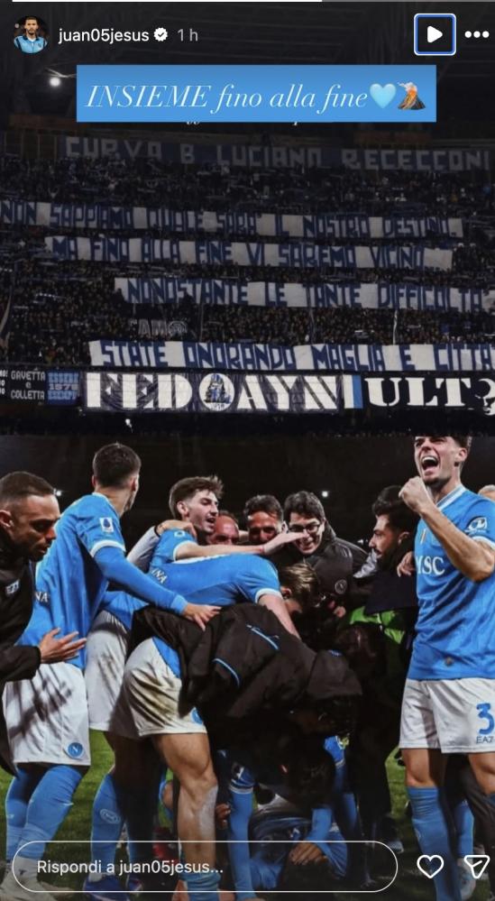 "Insieme fino alla fine!", l'emoji del cuore azzurro e del vulcano, e due fotografie: sotto la grande esultanza di squadra al gol di Alisson Santos, sopra lo striscione di ringraziamento della Curva B. In questo modo Juan Jesus, tramite una story sul suo profilo Instagram suona la carica per il momento ancora difficile del Napoli. Il difensore brasiliano è sempre più leader dello spogliatoio azzurro. Di seguito la foto.