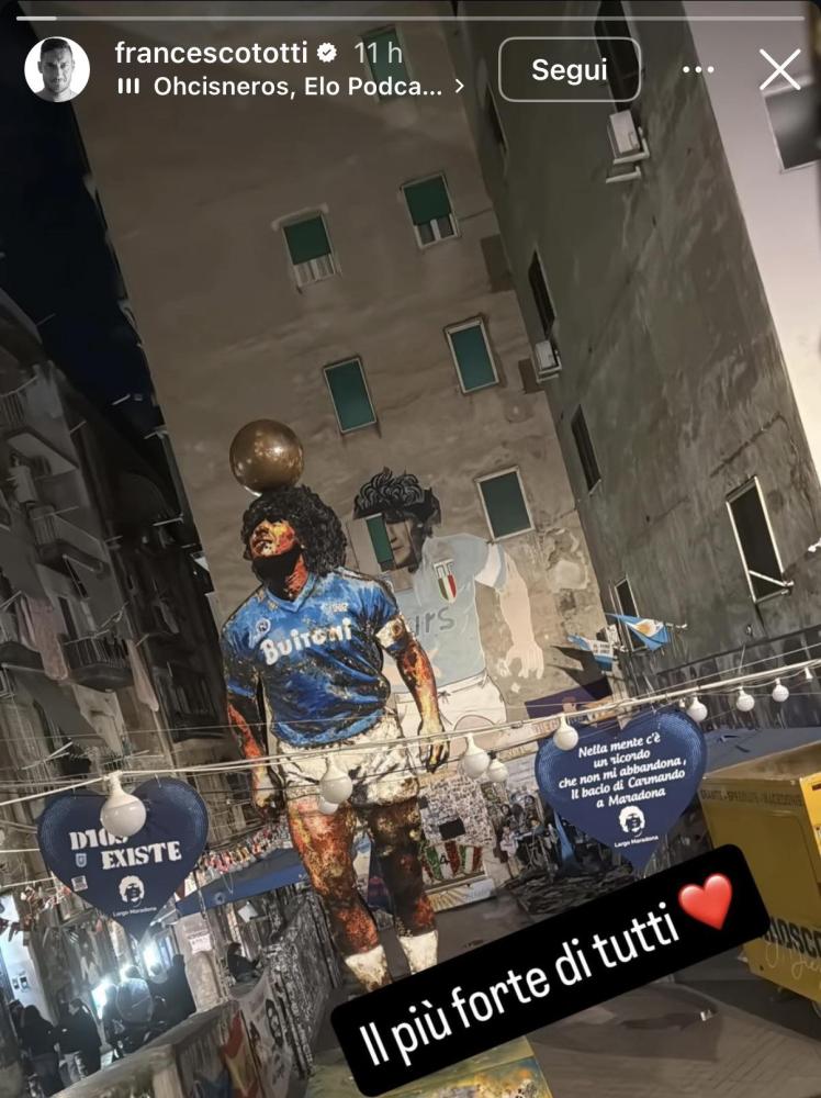 Totti celebra Maradona: “Il più forte di tutti”. Un omaggio diretto, semplice, ma carico di significato. Francesco Totti ha condiviso nelle ultime ore una storia Instagram che ha immediatamente catturato l’attenzione dei tifosi azzurro. Lo sfondo è uno dei luoghi più iconici di Napoli: il celebre murales dedicato a Diego Armando Maradona nei Quartieri Spagnoli.