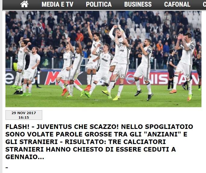 Clamoroso retroscena sulla Juventus, svelato oggi pomeriggio da Dagospia. Una nuova tormenta, simile a quella dell'intervallo della finale di Cardiff, avrebbe investito lo spogliatoio bianconero: "Juventus, che scazzo! Nello spogliatoio sono volate parole grosse tra gli "anziani" e gli stranieri - risultato: tre calciatori stranieri hanno chiesto di essere ceduti a gennaio...".