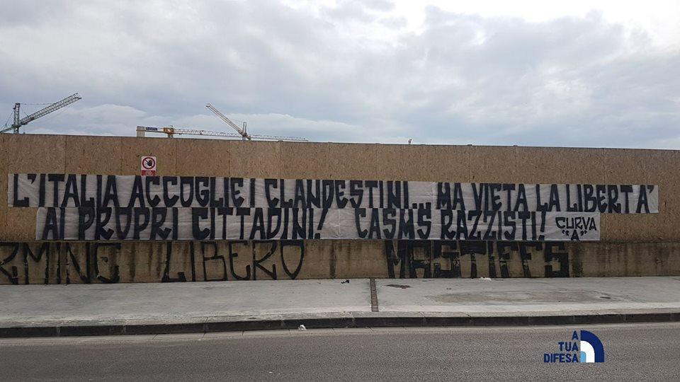 Reazione furente degli ultras della Curva A al divieto di trasferta a Cagliari imposto dal Casms. Come riportato dalla pagina Facebook 'A tua difesa', in città sono apparsi alcuni striscioni con questo testo: "L'Italia accoglie clandestini, ma vieta la libertà ai propri cittadini! Casms razzisti!".