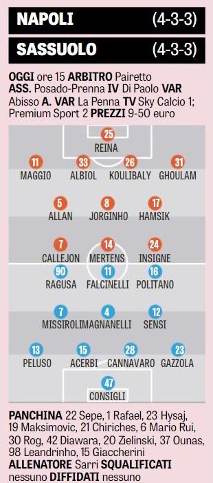Quattro cambi rispetto all'ultima formazione per Sarri. Contro il Sassuolo infatti tornano Albiol, Jorginho ed Allan e dovrebbe esserci Maggio a destra al posto di Hysaj. Nel Sassuolo Ragusa al posto dell'infortunato Berardi e recupera Cannavaro in difesa.