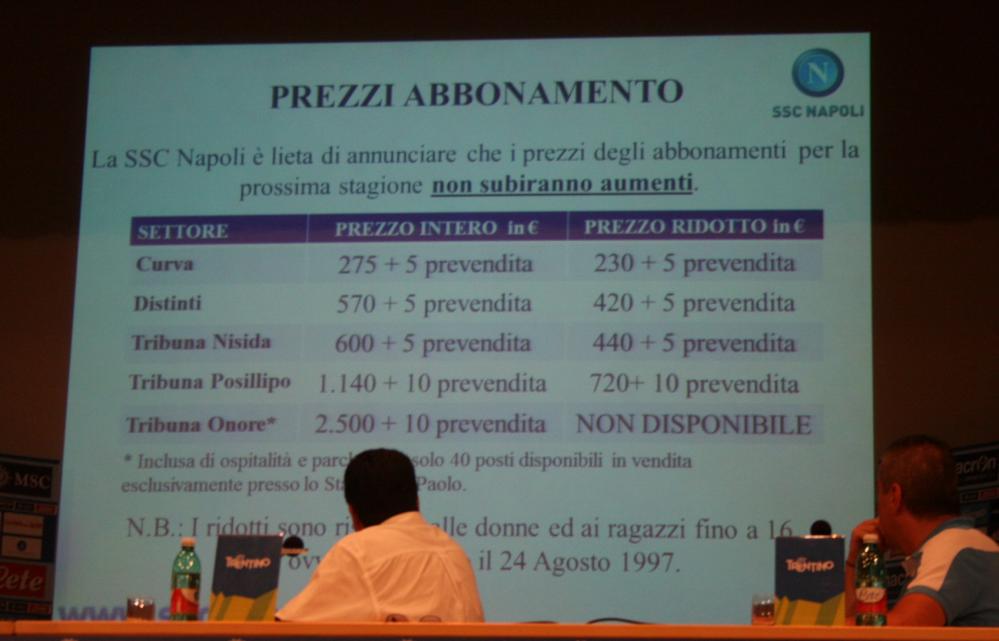15.58 - Ha inizio la conferenza stampa. Formisano: "La campagna abbonamenti partirà nella giornata di domani. I prezzi degli abbonamenti rimangano invariati. Dall'anno della Serie B può essere acquistata con un pagamento rateale a tasso zero in dodici mesi. Può essere acquistato da chi ha la tessera del tifoso, ma ricordo che dalla scorsa stagione che per chi non possiede la tessera può comunque abbonarsi acquistando il voucher elettronico. Uno strimento molto simile alla tessera che permette di recarsi al botteghino dello stadio, riempire il modulo, farsi fotografare e chiedere l'abbonamento. Acquistando abbonamenti multipli si possono abbassare anche alcuni costi fissi. Il nostro sito internet ha tutte le informazioni di legge relativi all'abbonamento. L'accesso al finanziamento sarà disponibile dal 24 luglio presso il botteghino numero 6 del San Paolo. Per accedere è necessario presentare un documento di identità. Per gli abbonamenti in curva, invece, servono due documenti di identità".