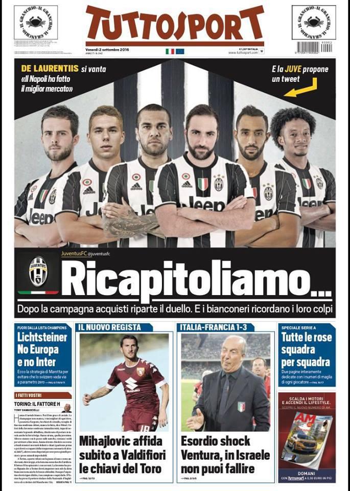 "Ricapitoliamo..." rilancia Tuttosport, riprendendo il cinguettio della Juventus e parlando di "duello" tra Napoli e Juve perchè "De Laurentiis si vanta: 'Il Napoli ha fatto il miglior mercato'", leggendo il virgolettato attribuito al patron azzurro dal quotidiano torinese.