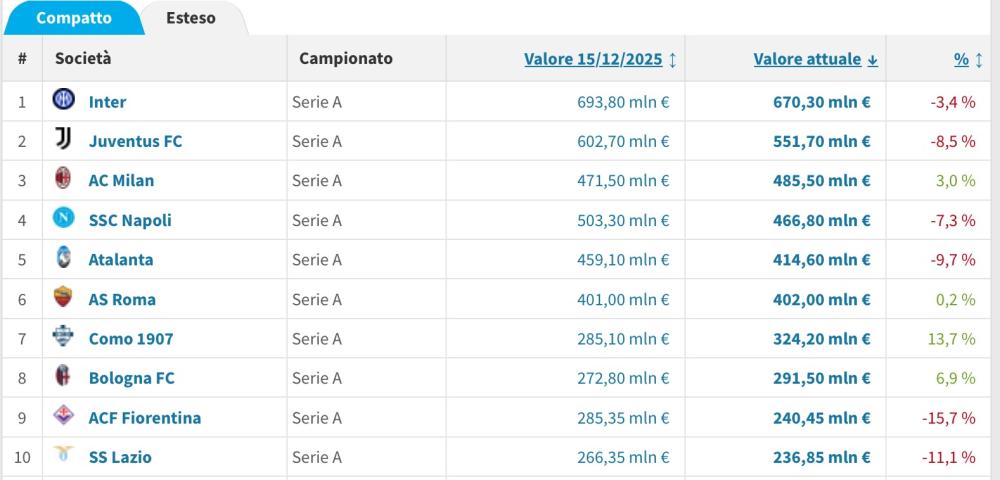 Tutto ciò, associato a quanto rallentamento in classifica, lo sconta in primis la Juventus (-53 milioni), forse con un arsenale più giovane, ma con tanti problemi, soprattutto in attacco. Fra le altre perdono oltre 44 milioni l'Atalanta e la Fiorentina, con la prima alle prese con la problematica separazione col Gasp, e la seconda che, contro ogni aspettativa, giace in fondo al tabellone ed è ora chiamata all'impresa per restare in Serie A. C'è anche chi ha motivo per gioire, ovviamente. Il Como (+39,1 milioni), in particolare, trainato dai propri giovani capitanati da Nico Paz, ma anche da Jacobo Ramón e Jayden Addai".