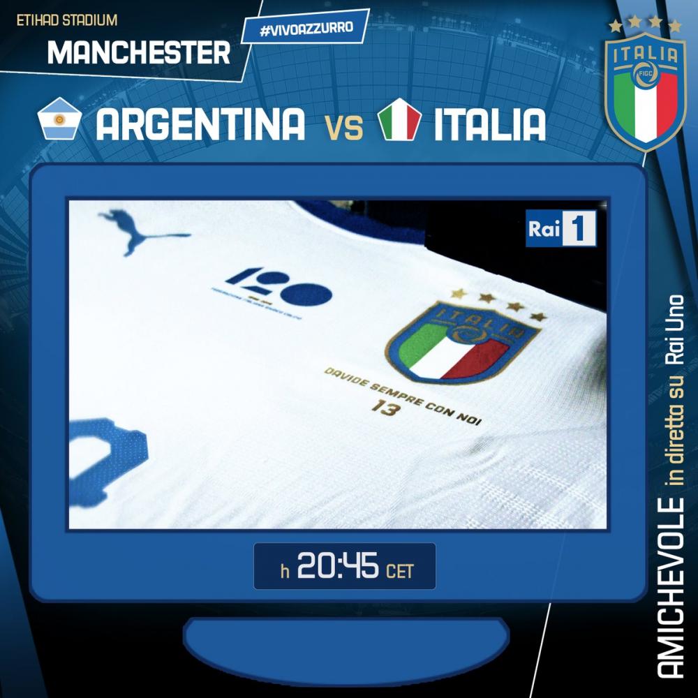 "Davide sempre con Noi" è la scritta che comparirà sulle maglie degli #Azzurri 🇮🇹 nell'amichevole con l'#Argentina 🇦🇷 in programma questa sera a #Manchester alle 20.45 CET.#VivoAzzurro pic.twitter.com/I7C0wZ6AkQ