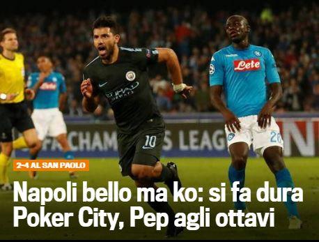 "Napoli bello ma ko: si fa dura. Poker City, Pep agli ottavi". E' questo il titolo dedicato al Napoli da La Gazzetta dello Sport, che mette il match di Champions League in primo piano nella sua edizione online.