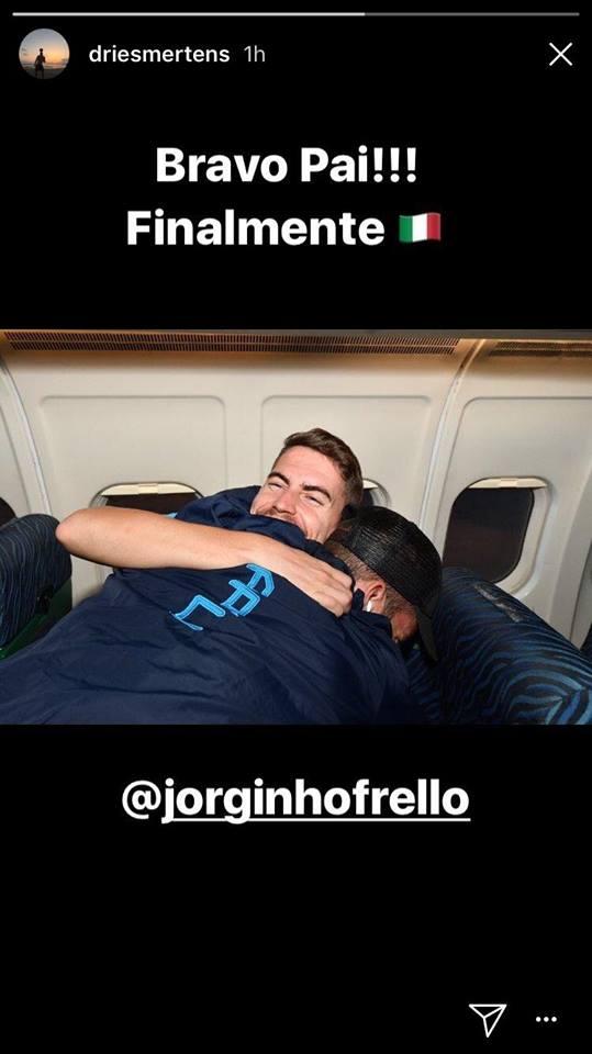 Bellissima immagine pubblicata su Instagram da Dries Mertens, che ha condiviso una foto del suo abbraccio a Jorginho per festeggiare la tanto attesa convocazione in Nazionale: "Bravo Pai, finalmente!".