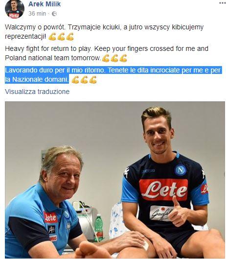 "Lavorando duro per il mio ritorno. Tenete le dita incrociate per me e per la Nazionale domani". Scrive così su Facebook Arkadiusz Milik, alle prese con la riabilitazione dopo l'intervento chirurgico subito per la lesione del legamento crociato del ginocchio sinistro. Ecco la foto pubblicata insieme al dottor Alfonso De Nicola: