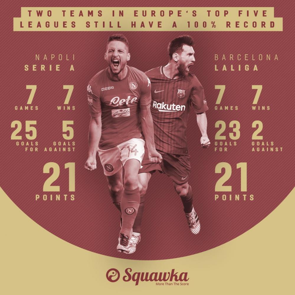 Napoli e Barcellona, protagoniste in Italia ed in Spagna ma contestualmente anche nel resto d'Europa. Le due squadre, infatti, sono le uniche ancora a punteggio pieno dei primi cinque top campionati europei. Numeri importanti sia da una parte che dall'altra, come mostra la foto pubblicata da Squawka Football.
