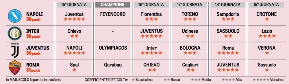 Napoli in vetta, Inter, Juve e Roma ad inseguire. Questa la situazione in classifica, con gli azzurri che tengono la testa respingendo l’attacco dell’Inter. La Gazzetta dello Sport con questo grafico propone i prossimi incontri del quartetto di testa.