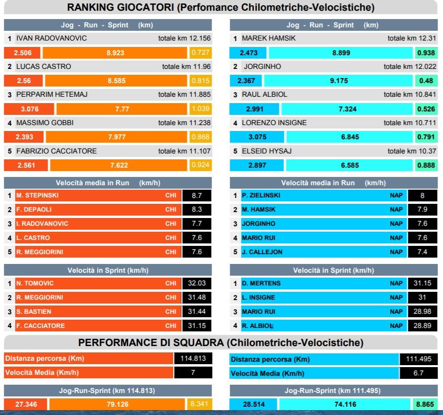 Non sono bastati 111km percorsi al Napoli per avere la meglio del Chievo. La squadra di Maran s'è confermata la squadra che corre di più del campionato con addirittura 114,8km percorsi. Tra gli azzurri il migliore è Marek Hamsik che è andato sopra quota 12km, a seguire Jorginho ed Albiol. Di seguito i dati della Lega Serie A