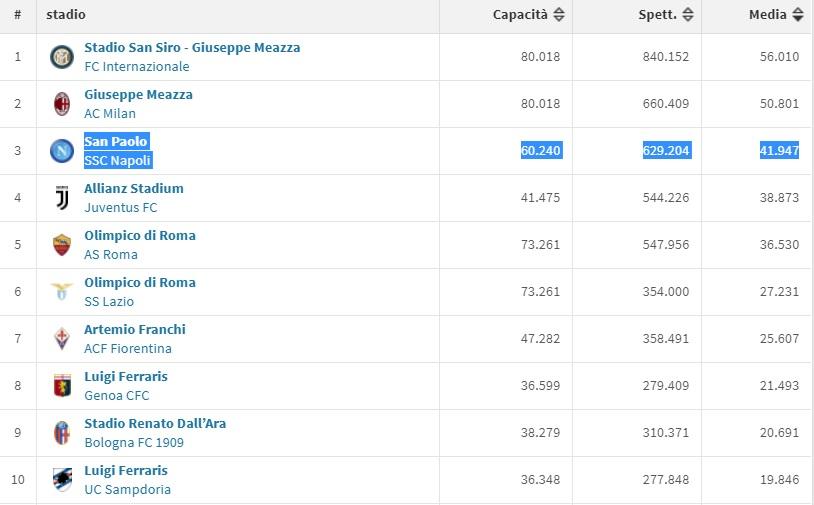 Il Napoli è terzo per media spettatori. Nonostante il calo delle ultime gare casalinghe, i partenopei si attestano a quota 41.947 spettatori di media a partita, dietro al Milan con 50.801 e l'Inter con 56.010. Il Napoli è davanti ai 36.530 della Roma ed ai 38.873 della Juventus che paga la capienza ridotta dell'impianto. Di seguito il grafico con tutti i dati