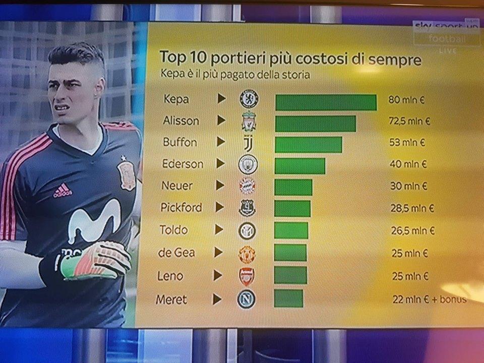 Con l'acquisto di Kepa da parte del Chelsea è già stato stracciato il record di Alisson: ora è lui il portiere più costoso, visto che è stato pagato 80 milioni. Nei dieci portieri più costosi della storia - come mostra il seguente grafico di Sky - c'è anche Alex Meret, pagato 22 milioni più bonus. E probabilmente è anche per questo che il Napoli non vuole un portiere di grosso spessore adesso come ultima pedina: salvaguardare l'investimento fatto per il classe '97 è importante per il club azzurro.