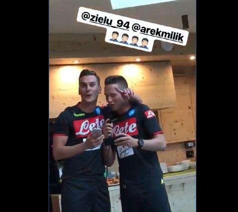 Il rito del Karaoke voluto da mister Ancelotti tocca anche agli ultimi arrivati Milik e Zielinski. in basso, le immagini pubblicate su Instagram da Elseid Hysaj, con i due polacchi protagonisti e presi simpaticamente in giro dai compagni.