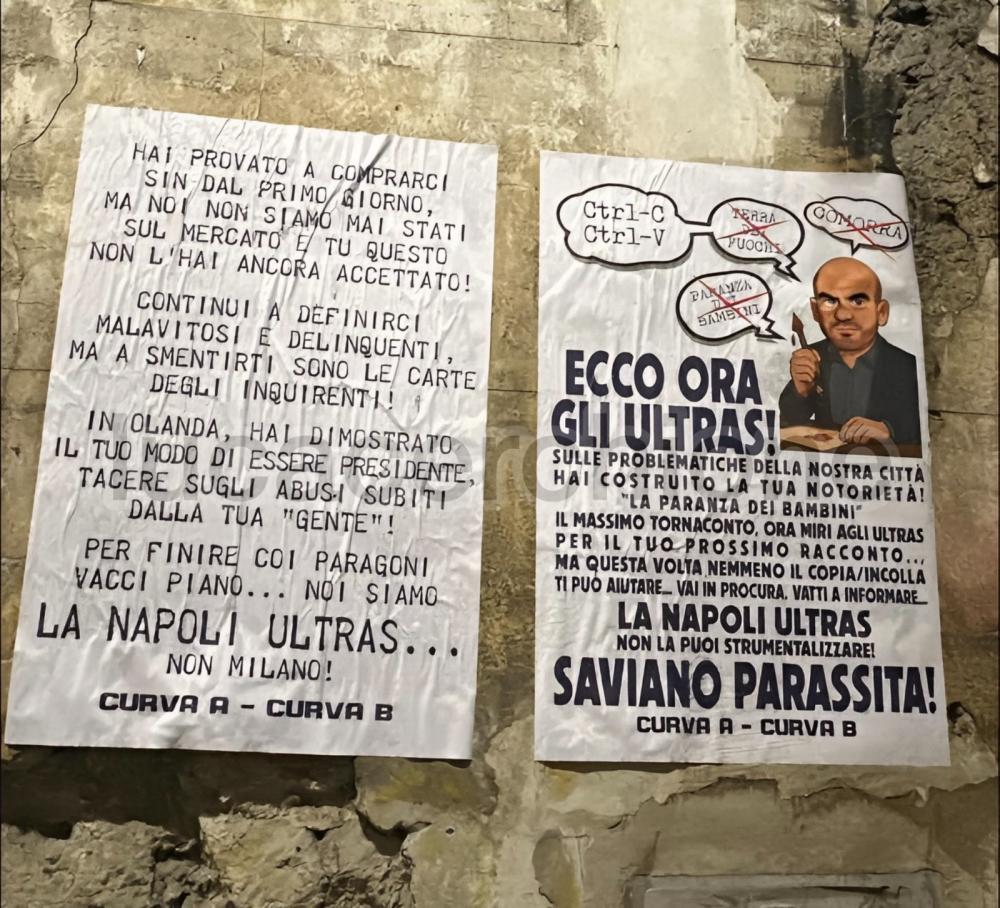 Un secondo manifesto è invece diretto a Roberto Saviano, accusato dagli ultras di speculare sulle problematiche della città: "Sulle problematiche della nostra città hai costruito la tua notorietà! 'La paranza dei bambini' il massimo tornaconto, ora miri agli ultras per il tuo prossimo racconto... ma questa volta nemmeno il copia/incolla ti può aiutare. Vai in Procura, vatti a informare la Napoli Ultras non la puoi strumentalizzare! Saviano parassita!". Di seguito le immagini dei due manifesti.