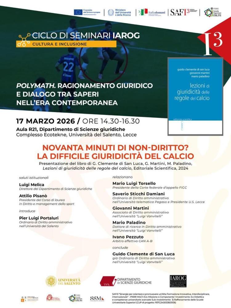 "Novanta minuti di non-diritto? La difficile giuridicità del calcio", si intitola così il seminario in cui, il 17 marzo dalle ore 14:30 presso l'Università del Salento, verrà presentato "Lezioni di giuridicità delle regole del calcio", il libro del Professor Guido Clemente di San Luca autore insieme a Giovanni Martini e Mario Paladino. Alla discussione parteciperanno ospiti illustri, tra cui Saverio Sticchi Damiani, presidente US Lecce, Mario Luigi Torsello, presidente della Corte federale d'appello FIGC, Ivano Pezzuto, arbitro effettivo CAN A-B.