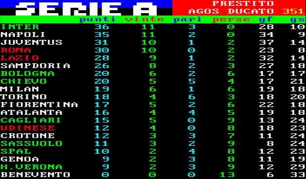 Con la vittoria di questa sera l'Inter si porta per una notte in testa alla classifica. I nerazzurri arrivano a quota 36 punti, uno in più del Napoli che giocherà domani alle 15 contro l'Udinese.