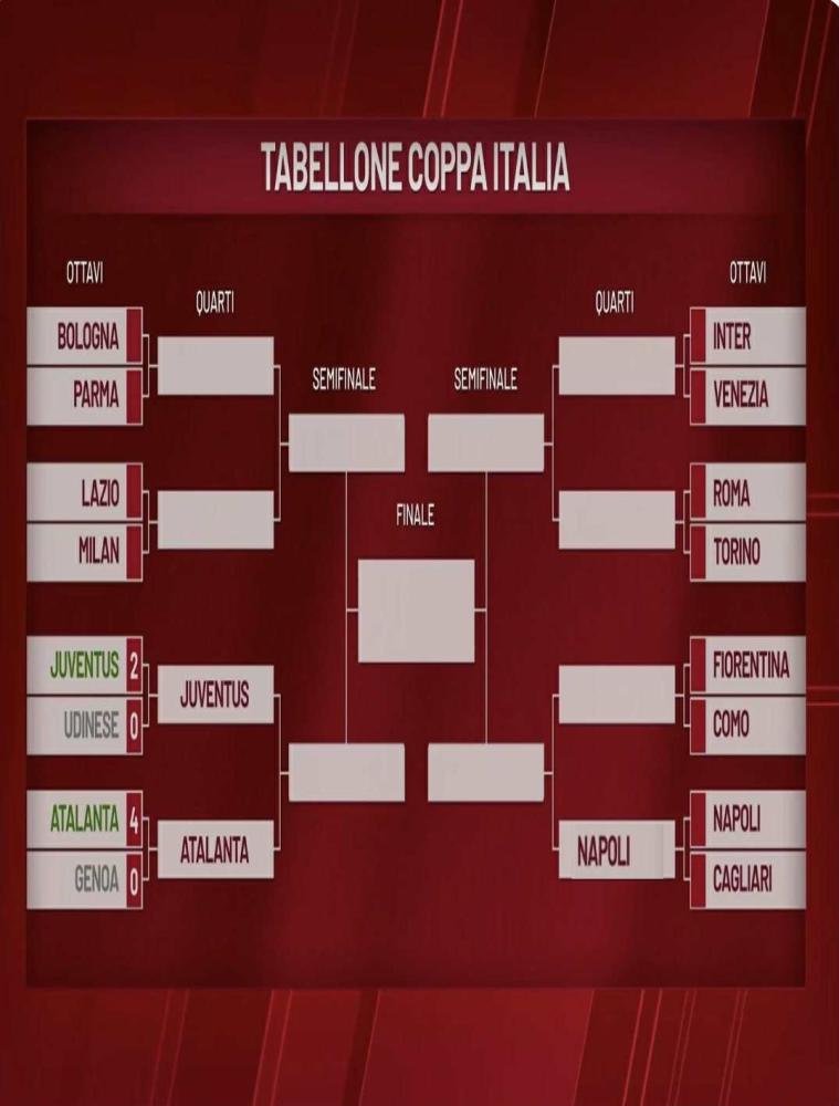 Il Napoli batte il Cagliari ai calci di rigore dopo una lunghissima lotteria terminata 9-8 per gli azzurri (1-1 al 90') ed accede ai quarti di finale di Coppa Italia. I campioni d'Italia dovranno affrontare al prossimo turno la vincente di Como-Fiorentina. Di seguito il tabellone di Coppa Italia completo.