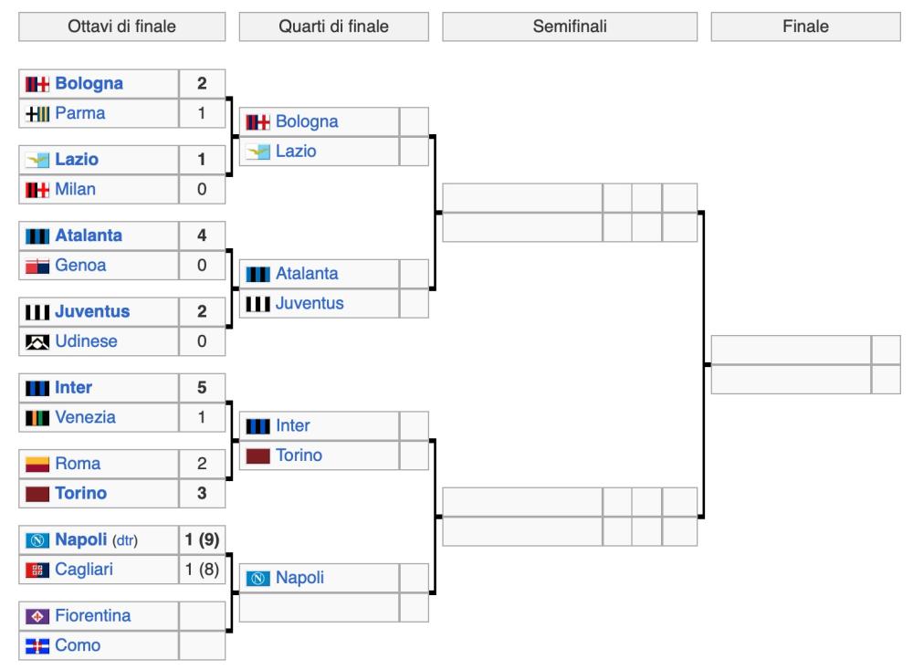 Il Torino approda ai quarti di Coppa Italia dopo aver eliminato la Roma e affronterà l’Inter, già qualificatasi a dicembre grazie al successo sul Venezia. Il Milan è uscito di scena, battuto in casa dalla Lazio, mentre il Napoli ha avuto la meglio sul Cagliari solo ai rigori, dopo l’1-1 nei tempi regolamentari. L’unico ottavo ancora da definire è Fiorentina-Como, in programma martedì 27 gennaio, con il vincitore che affronterà i campioni d’Italia in carica.