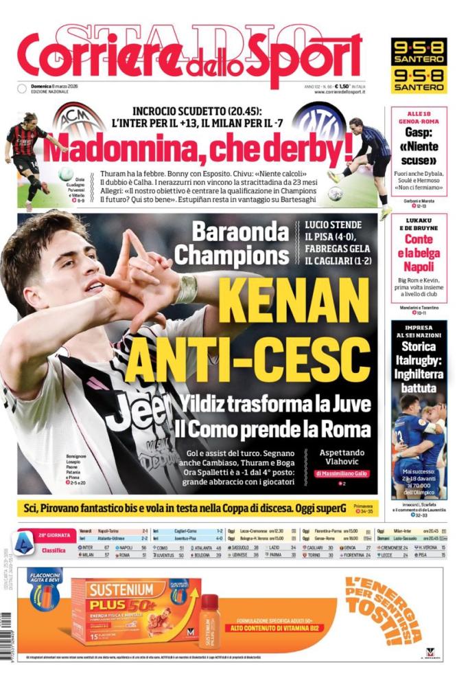 "Kenan Anti-Cesc" è il titolo del Corriere dello Sport che celebra la prestazione del fantasista bianconero: Spalletti è a un solo punto dal quarto posto. Il derby di Milano domina il taglio alto. La sfida serale tra Milan e Inter (calcio d'inizio alle 20.45) è il piatto forte della domenica calcistica italiana. Il Corriere titola con enfasi "Madonnina, che derby!", sottolineando la posta in palio scudetto: i nerazzurri vanno a caccia del +13 in classifica, i rossoneri invece cercano di ridurre il gap a -7. Inter che non vince la stracittadina da 23 mesi, con Thuram in dubbio per la febbre e il ballottaggio in casa Milan tra Bonny ed Esposito.