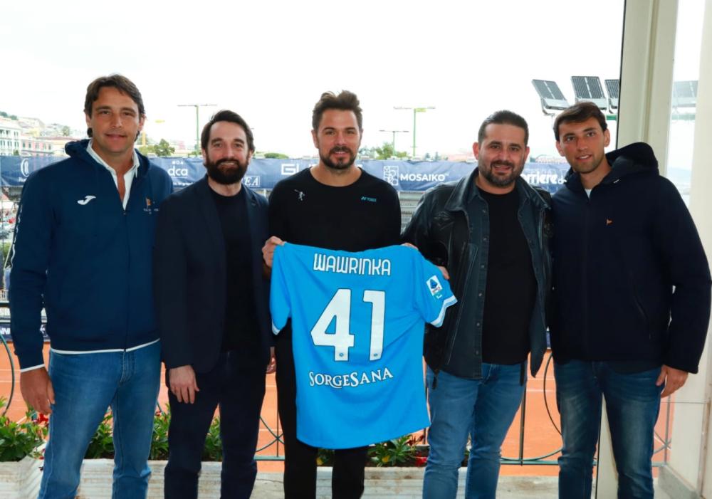 Edo De Laurentiis e Bianchini alla Guerri Napoli Tennis Cup: maglia azzurra personalizzata in omaggio a Wawrinka, tre volte campione Slam