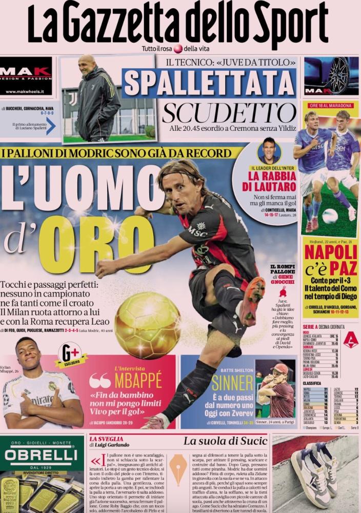"L'uomo d'oro" scrive La Gazzetta dello Sport dedicando la sua apertura a Luka Modric. I suoi palloni sono già da record. Tocchi e passaggi perfetti: nessuno in campionato ne fa tanti come il croato. Il Milan di Massimiliano Allegri ruota attorno alla sua classe e per il big match Scudetto con la Roma, Max recupera Rafa Leao.