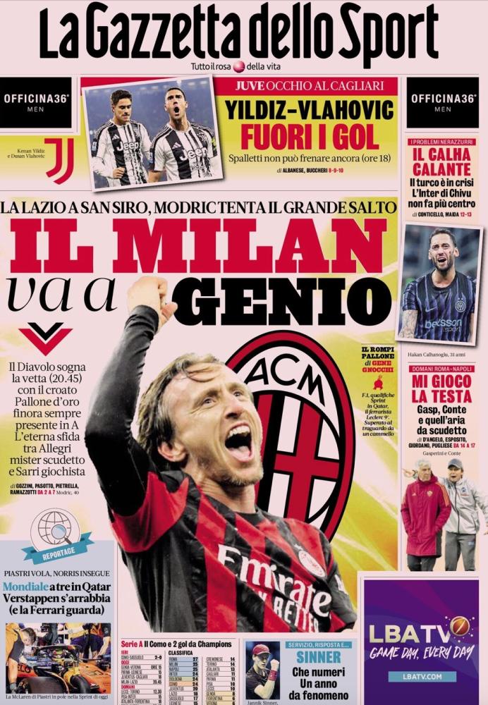 "Il Milan va a genio" è il titolo con cui si apre l'odierna edizione de La Gazzetta dello Sport oggi in edicola in merito al prossimo impegno contro la Lazio. A San Siro arrivano i biancocelesti e il Milan di Allegri sogna la vetta. Si aggrappa a Modric, finora sempre presente in Serie A, per cercare di prendersi la testa della classifica almeno per una notte.