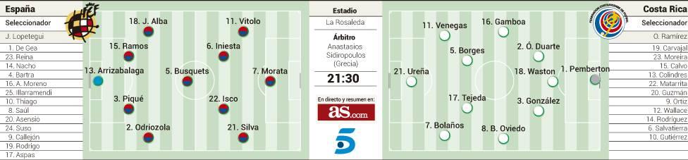 Ancora niente maglia da titolare per José Maria Callejon con la Spagna. Secondo le probabili formazioni pubblicate oggi da AS, Lopetegui punterà per l'amichevole contro la Costa Rica su Morata prima punta, sostenuto sulle corsie esterne da Silva e Vitolo. In porta, Lopetegui preferisce Kepa a De Gea e Reina.