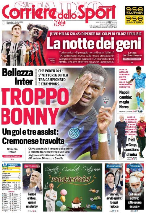 Finisce 4-1 in favore dell'Inter la sfida di San Siro fra gli uomini di Chivu e la Cremonese. La formazione nerazzurra dilaga contro i grigiorossi di Davide Nicola grazie ai gol di Lautaro, Bonny, Dimarco e Barella. "Troppo Bonny", titola il Corriere dello Sport.