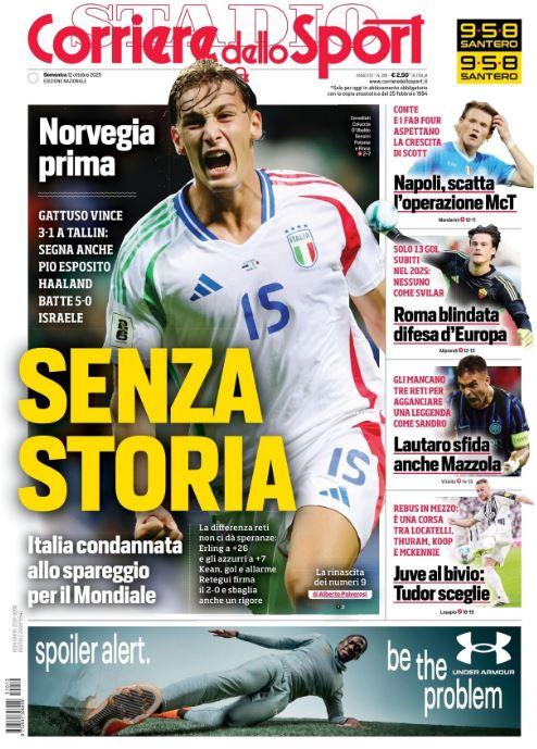 "Senza storia". Questo il titolo in prima pagina pagina dell'edizione odierna del Corriere dello Sport. Successo esterno ieri per l'Italia che ha superato 3-1 l'Estonia consolidandosi al secondo posto in classifica nel girone. La qualificazione ai Mondiali però gli azzurri se la dovranno giocare al playoff in quanto la Norvegia ha superato 5-0 Israele blindando di fatto la prima piazza.