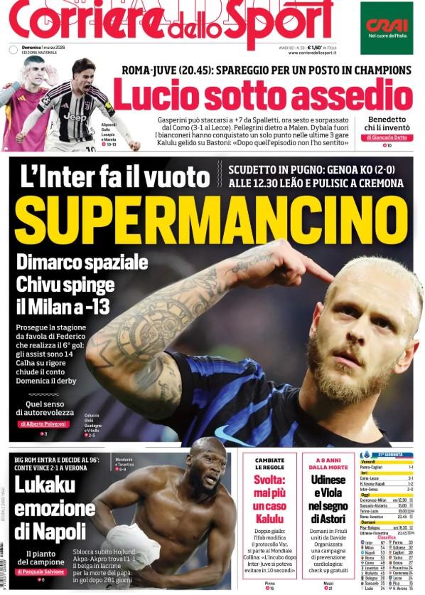 "Supermancino". E' questo il titolo che il Corriere dello Sport sceglie per la prima pagina di oggi. Il riferimento è a Dimarco, definito spaziale dal quotidiano, ricordando che si tratta del sesto gol, mentre gli assist sono 14. L'Inter fa il vuoto - si legge ancora - portandosi a +13 sul Milan.