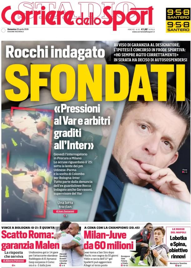 "Sfondati". Questo il titolo in prima pagina dell'edizione odierna del Corriere dello Sport. Il riferimento è al terremoto che ha colpito il mondo arbitrale con Rocchi indagato per frode sportiva. Il designatore degli arbitri, secondo il PM, avrebbe fatto pressioni al VAR e scelto arbitri che sarebbero stati "graditi" all'Inter.