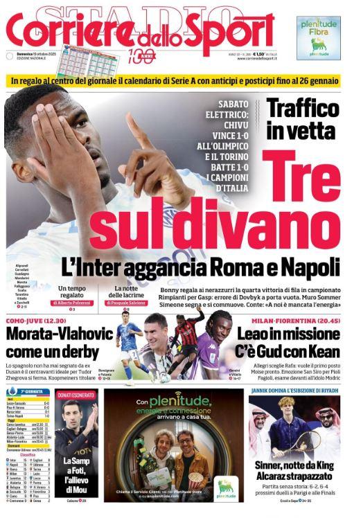 "Tre sul divano". Questo il titolo in prima pagina dell'edizione odierna del Corriere dello Sport. Il riferimento ovviamente è al "traffico" che c'è in vetta alla classifica. Nella serata di ieri l'Inter di Cristian Chivu ha superato 1-0 la Roma di Gian Piero Gasperini agganciando in vetta alla classifica proprio i giallorossi e anche il Napoli che nel frattempo è stato battuto, sempre per 1-0, a Torino dai granata di Marco Baroni.