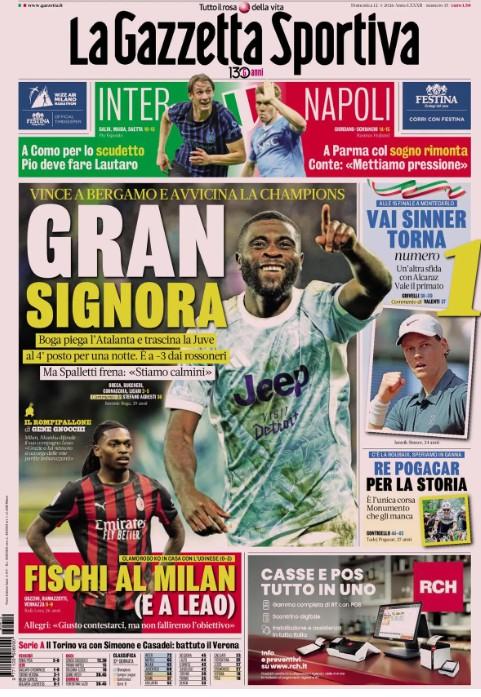 La Gazzetta dello Sport oggi in edicola dedica spazio anche a questo, in taglio alto. "A Parma col sogno rimonta. Conte: mettiamo pressione", si legge sul quotidiano. In primo piano spazio al successo della Juventus contro l'Atalanta: "Gran Signora". Infine lo 0-3 rimediato dal Milan a San Siro contro l'Udinese: "Fischi al Milan (e a Leao)".