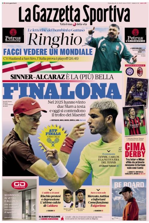"Ringhio, facci vedere un Mondiale". Questo il titolo in taglio alto di prima pagina dell'edizione odierna della Gazzetta dello Sport. Questa sera l'Italia scenderà in campo a San Siro per sfidare la Norvegia nell'ultimo turno di qualificazione al Mondiale 2026. Gli azzurri sono già sicuri dei playoff che si disputeranno a marzo prossimo. L'obiettivo è qualificarsi per la competizione dopo due edizioni di assenza.