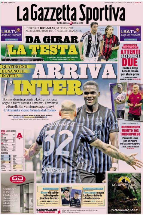 L’Inter batte 4-1 la Cremonese e si regala, almeno per 24 ore, una serata da prima in classifica. Questa l’apertura odierna de La Gazzetta dello Sport, che celebra il 4-1 della squadra di Chivu: "Arriva l'Inter". Spazio poi anche al Napoli e alla Roma, di spalla: "Attenti a questi due! Conte e Gasp, le mosse per stare primi".