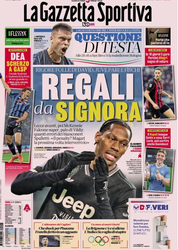 L'edizione odierna de La Gazzetta dello Sport apre con la 18^ giornata di Serie A, iniziata venerdì sera con la vittoria del Milan e proseguita ieri con cinque partite tra cui il pareggio della Juventus contro il Lecce e il ko della Roma sul campo dell'Atalanta. Bianconeri che non vanno oltre l'1-1 all'Allianz Stadium, dove McKennie riacciuffa ad inizio ripresa la rete realizzata in pieno recupero di primo tempo da Banda. Decisivo per gli uomini di Spalletti il rigore fallito da David al 66', con il centravanti canadese che si è visto respingere da Falcone uno scialbo tentativo col cucchiaio. In serata grande emozione per il ritorno di Gasperini a Bergamo ma la sua Roma perde la quarta partita nelle ultime sei e si vede raggiungere in classifica proprio dai bianconeri.