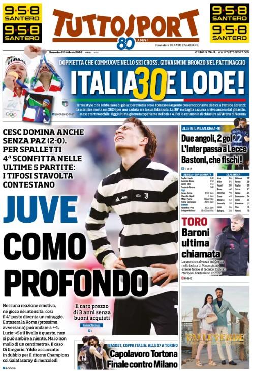 "Juve, Como profondo". Con questo gioco di parole Tuttosport apre l'edizione odierna, titolando così in prima pagina. Fabregfas domina anche senza Nico Paz - si legge - e per Spalletti arriva la quarta sconfitta nelle ultime cinque partite: i tifosi stavolta contestano. Di spalla spazio anche all'Inter: "Due angoli, due gol. L'Inter passa a Lecce. Bastoni, che fischi!".