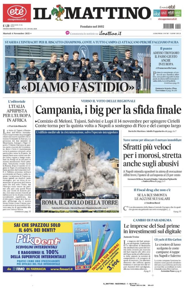 Nella prima pagina odierna Il Mattino apre con la frase forte pronunciata da Antonio Conte in conferenza stampa: "Diamo fastidio". Il sommario: "Stasera l'Eintracht per il riscatto Champions, Conte a tutto campo: 'Ci attaccano perché facciamo paura'". Di seguito la prima pagina integrale.