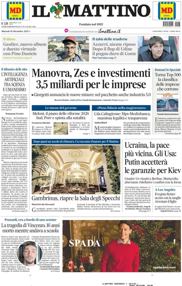 Nell'edizione di oggi, Il Mattino dedica spazio al Napoli in prima pagina: "Azzurri, niente riposo. Dopo il flop di Udine il pugno duro di Conte". In taglio alto spazio all'uscita del nuovo album di Geolier: "Geolier, nuovo album e duetto virtuale con Pino Daniele". Di seguito la prima pagina integrale.