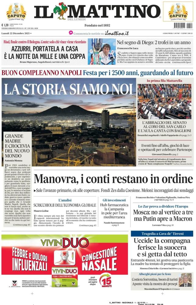 Nell'edizione di oggi, Il Mattino dedica spazio in prima pagina al Napoli, che stasera affronta il Bologna nella finale di Supercoppa italiana a Riyad: "Azzurri, portatela a casa. E' la notte da mille e una coppa. Conte: solo chi vince viene ricordato".